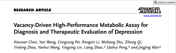 近日,上海市精神卫生中心彭代辉教授团队与华东师范大学化学与分子工程学院万晶晶教授团队合作在国际顶级期刊《ADVANCED MATERIALS》杂志(IF=27.4, JCR 1区)上发表了题为“Vacancy-driven High-performance Metabolic Assay for Diagnosis and Therapeutic Evaluation of Depression”的研究论文。该研究为抑郁症的诊断提供了新的客观的检测方法。华东师范大学的博士研究生陈晓楠和上海市精神卫生中心的王韵副主任医师为本文的第一作者,华东师范大学的万晶晶教授和上海市精神卫生中心的彭代辉主任医师为本文的通讯作者。